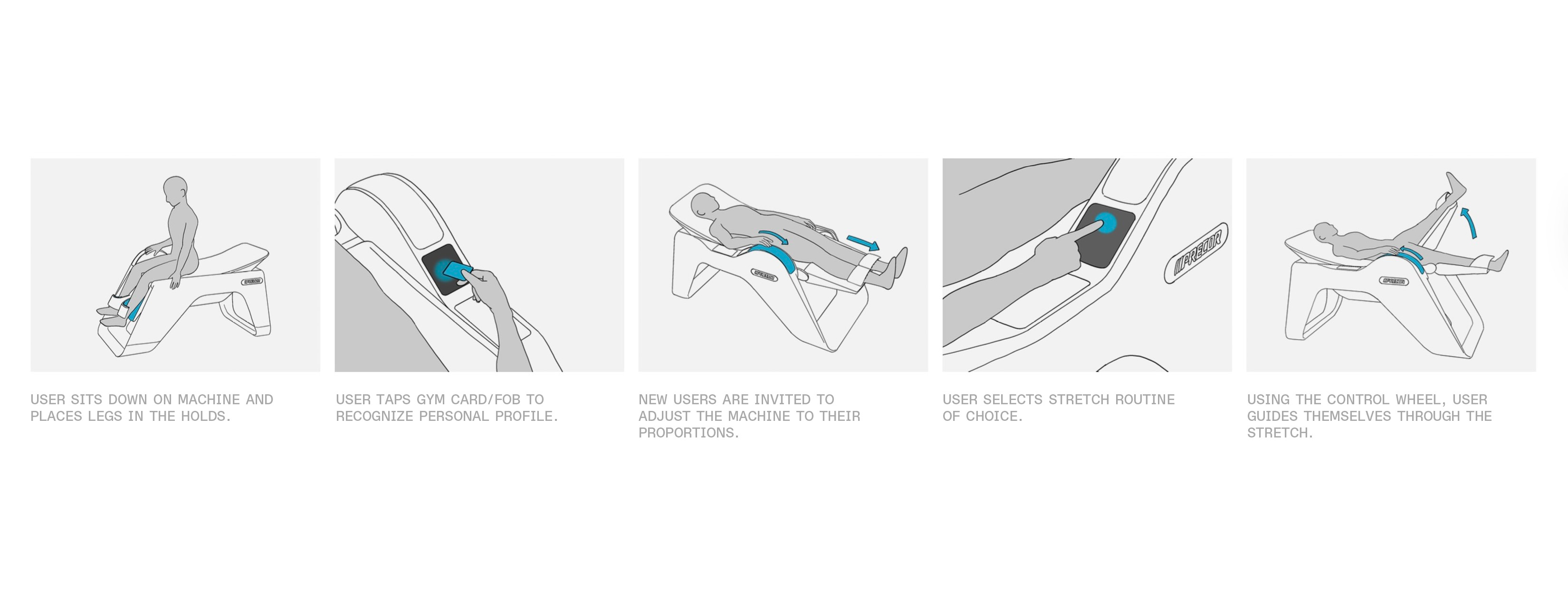 The machine adjusts to accommodate the proportions and ranges of motion of the 5th–95th percentiles of heights and sizes.